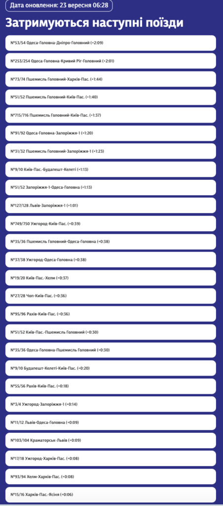 Внаслідок ворожого обстрілу та пошкодження інфраструктури в Кіровоградській області низка пасажирських потягів прямує з відчутними затримками. «Укрзалізниця» повідомляє, що затримки коливаються від кількох хвилин до понад двох годин. Найбільше ускладнено сполучення у напрямку Дніпра, Кривого Рогу та Запоріжжя.