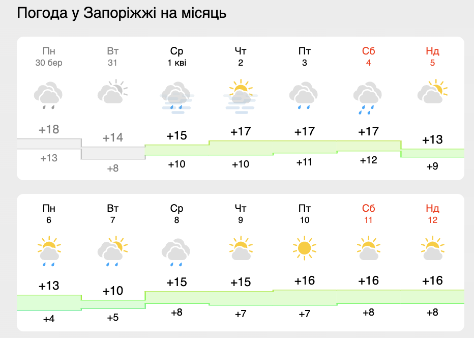 - Після прохолоднішого початку квітня погода в місті поступово вирівнюється. Уже з 9–12 квітня в Запоріжжі триматиметься майже однакова денна температура в межах +15…+16 градусів, а нічні показники коливатимуться від +7 до +8.