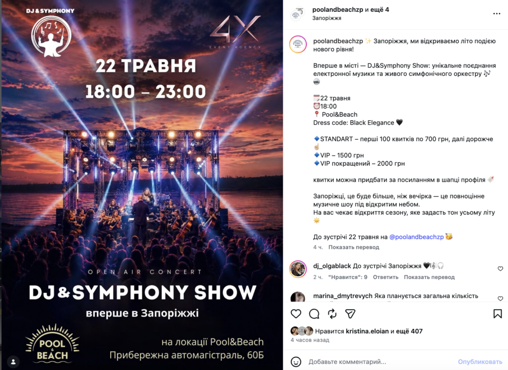 У Запоріжжі анонсували відкриття літнього сезону на локації Pool&Beach. Комплекс повідомив, що перша велика подія запланована на 22 травня. Формат обіцяють не просто клубний, а концертний: у місті вперше проведуть DJ&Symphony Show — поєднання електронної музики та живого симфонічного оркестру.