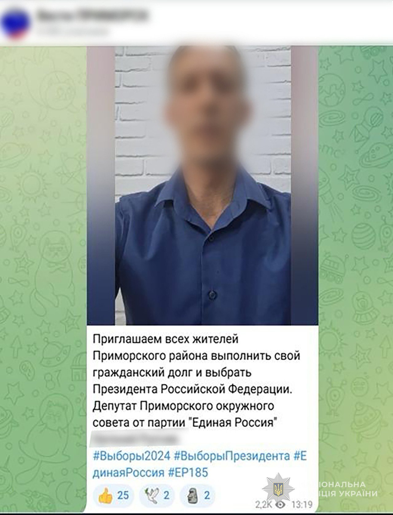Обвинувачуваний балотувався у “депутати” окупаційного органу влади у Приморському Бердянського району на псевдовиборах, які проводили загарбники у 2023 році. Після отримання посади зрадник брав участь у пропаганді ворога. У 2024 році пособник окупантів зняв відеозвернення, де агітував голосувати на “виборах” президента рф.