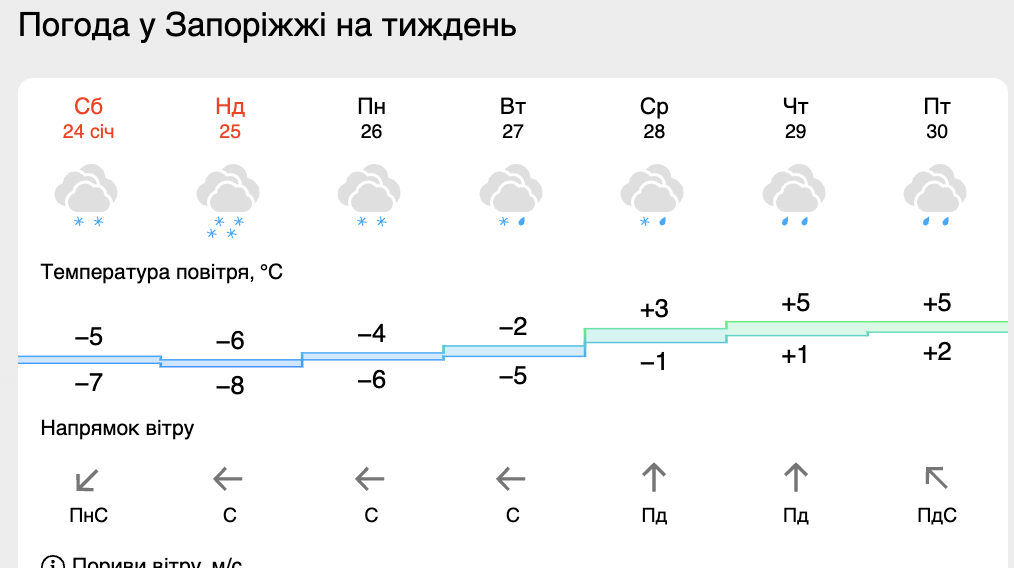 У Запоріжжі найближчий тиждень пройде під знаком поступового потепління та переходу від снігу до дощів. Після кількох морозних днів синоптична ситуація змінюється: температура повітря впевнено підіймається вище нуля, а опади стають переважно рідкими. Це вплине і на стан доріг, і на загальне самопочуття мешканців міста.