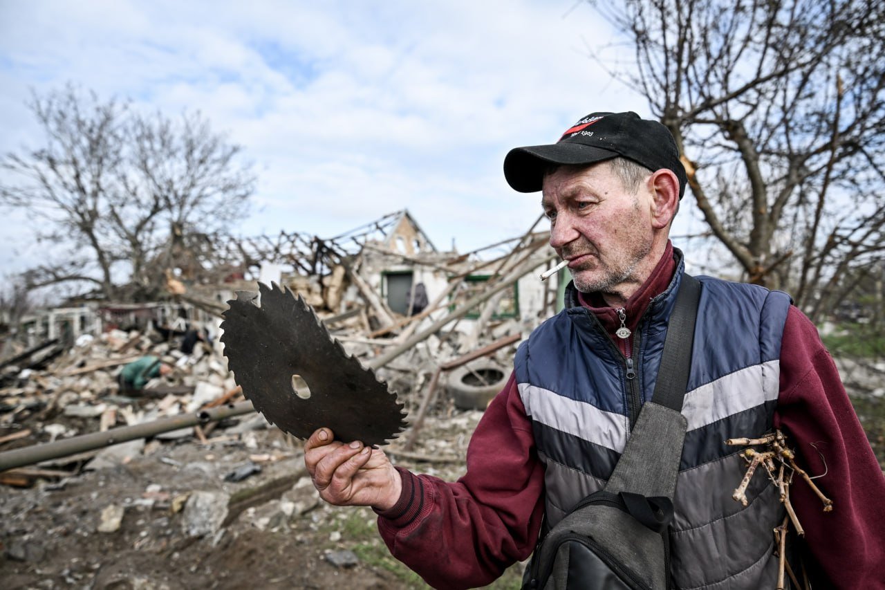 Він показує рукою на те, що лишилось від його будинку. Розгрібати завали йому допомагають знайомі. Чоловіки дістають з-під уламків інструменти. Хтось з них говорить, що тут такого має бути багато.