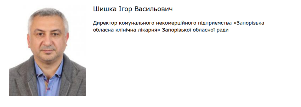 Ігор Шишка займає посаду директора комунального некомерційного підприємства «Запорізька обласна клінічна лікарня» Запорізької обласної ради.