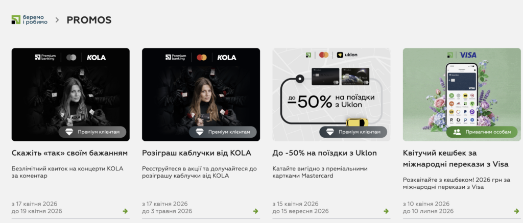 - акція для міжнародних переказів з карткою Visa — вона триває з 10 квітня до 10 липня 2026 року; банк зазначає, що щомісяця 100 переможців можуть отримати по 2026 грн кешбеку;