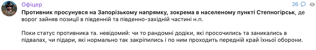 На Запорізькому напрямку зафіксовано просування російських військ. За словами офіцера з позивним «Алекс», противник зайняв позиції в південній та південно-західній частині населеного пункту Степногірськ.