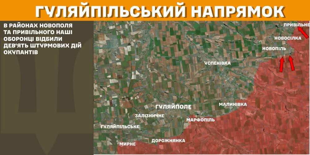 На Гуляйпільському напрямку в районах Новополя та Привільного наші оборонці відбили дев’ять штурмових дій окупантів.
