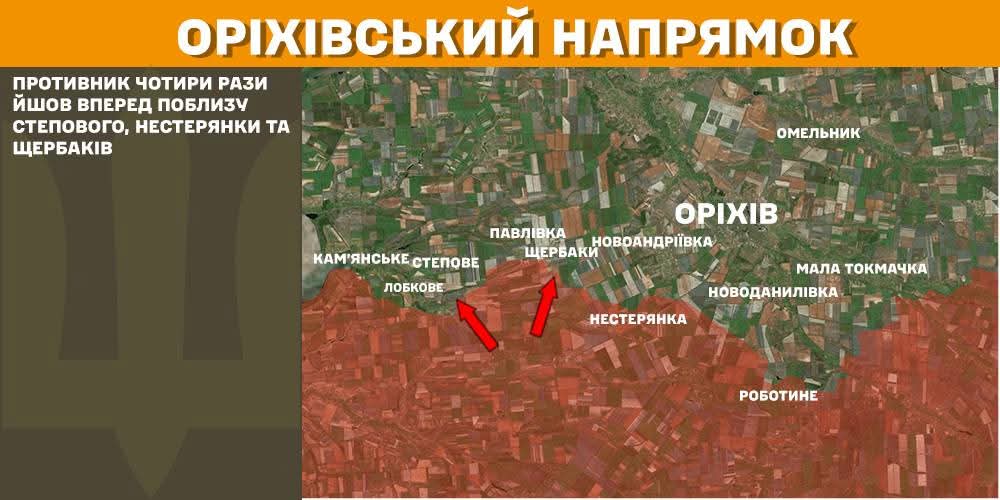 На Оріхівському напрямку противник чотири рази йшов вперед поблизу Степового, Нестерянки та Щербаків.