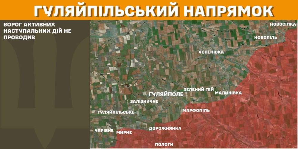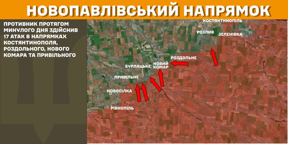 Водночас На Гуляйпільському і Придніпровському напрямках минулої доби ворог активних наступальних дій не проводив. Втім поряд, на схід від Гукляйполя на Новопавлівському напрямку противник протягом минулого дня здійснив 17 атак в напрямках Костянтинополя, Роздольного, Нового Комара та Привільного.