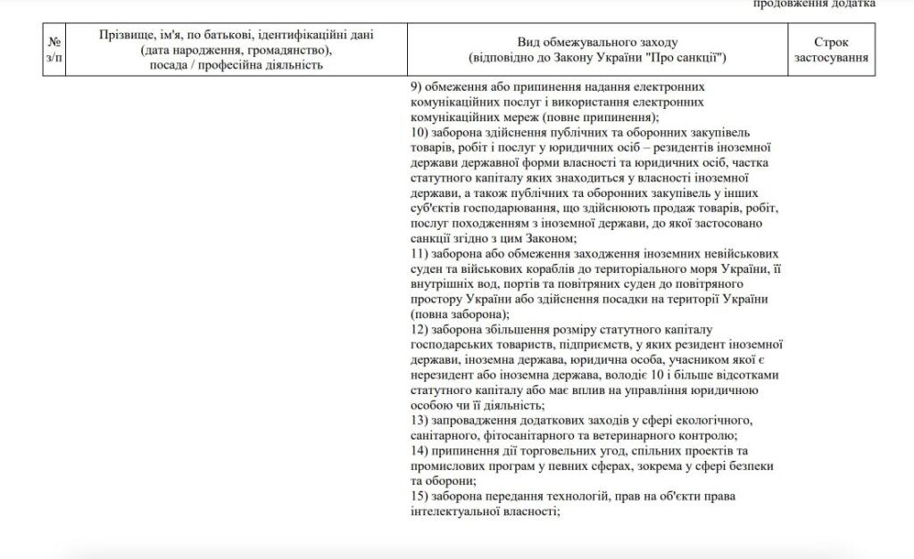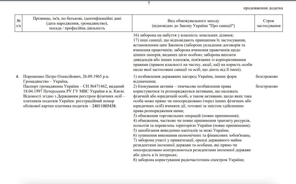 Санкції на Порошенка та інших накладено “безстроково”, тобто довічно. Вони включають позбавлення права користуватися та розпоряджатися нажитими активами.