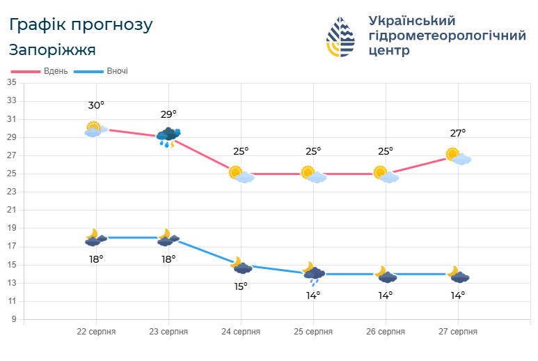 «Вдень 23 серпня, при проходженні атмосферного фронту, у місті очікуються помірний дощ з грозою, посилення північного вітру до 15-20 м/с, температура повітря 24-26° тепла.