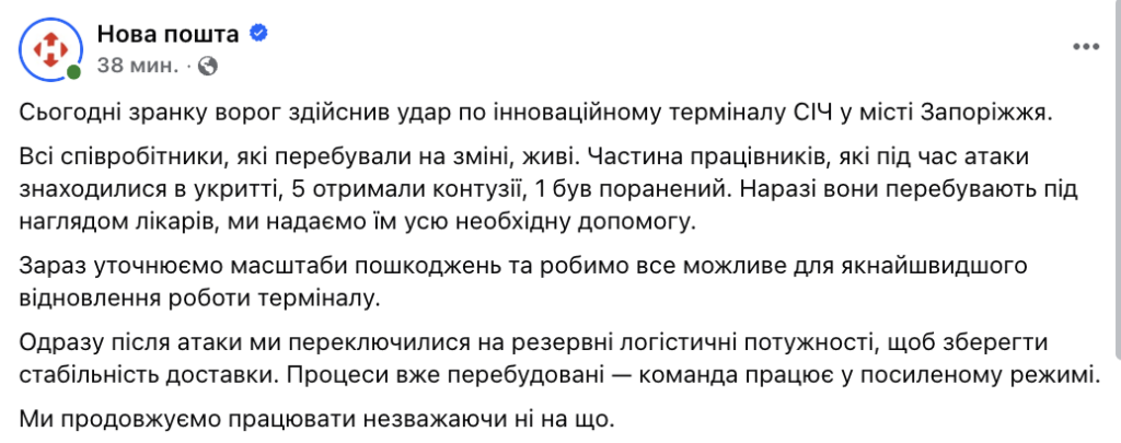 Після ранкового удару росіян по інноваційному терміналу «СІЧ» у Запоріжжі «Нова пошта» перебудувала логістику та переключилася на резервні потужності.