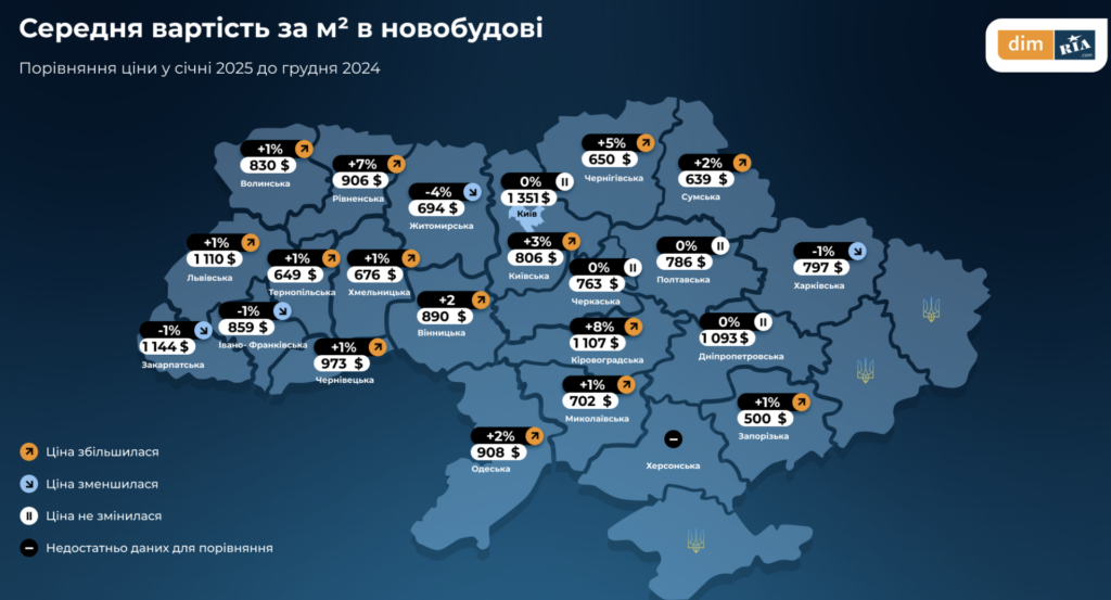 На карті показано середню вартість квадратного метра у новобудовах України в січні 2025 року з порівнянням до грудня 2024 року. У Запорізькій області цей показник становить 500 доларів США, що є одним із найнижчих в Україні. Водночас зафіксовано зростання ціни на 1%, попри складну ситуацію в регіоні, пов’язану з військовими діями та економічними викликами.