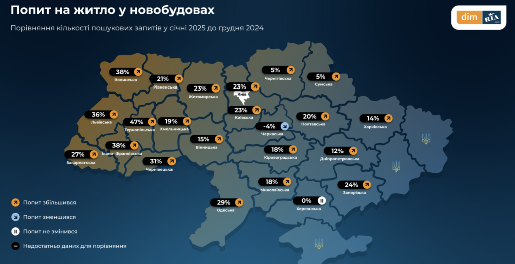 На карті відображено зміни попиту на житло в новобудовах у різних регіонах України за січень 2025 року порівняно з груднем 2024 року. У Запорізькій області попит зріс на 24%, що є одним із найзначніших показників у країні, хоча й поступається Тернопільській (47%) та Львівській (36%) областям.
