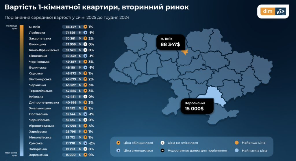 На графіку представлено середню вартість однокімнатної квартири на вторинному ринку в січні 2025 року з порівнянням до грудня 2024 року. У Запорізькій області цей показник становить 19 793 долари США, що є одним із найнижчих серед усіх регіонів України, поступаючись лише Херсонській області (15 000 доларів США). При цьому ціна у Запорізькій області залишилася незмінною.