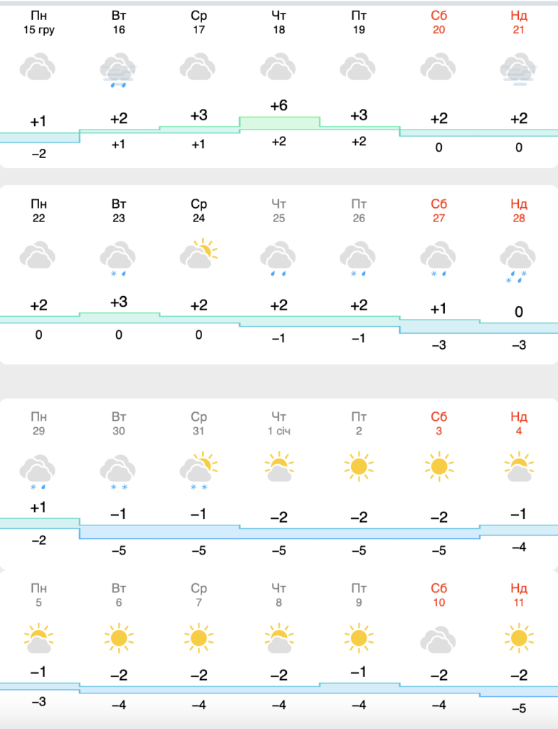 - До 25 грудня — денна температура 0…+3 градуси, нічні зниження до –1, без стійкого морозу.