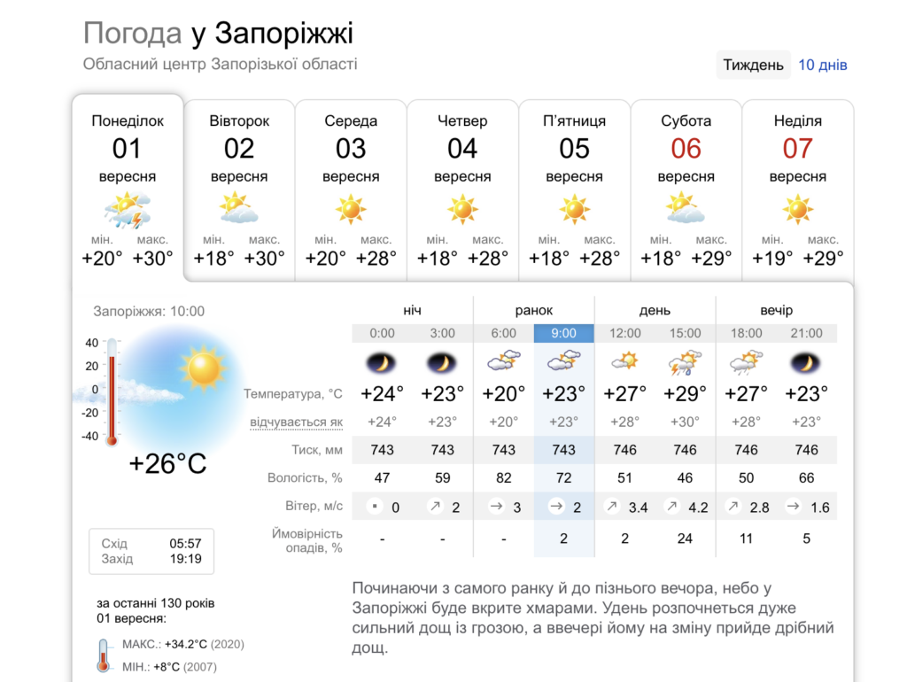 Погода в Запоріжжі Сіноптік на 1 вересня