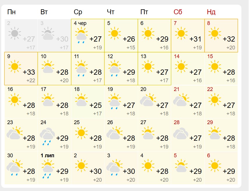 Очікується, що погода буде посушливою. Вдень температура повітря триматиметься на рівні +27 градусів Цельсія, а вночі опускатиметься до +18 градусів Цельсія. Подеколи ймовірні дощі з грозами.