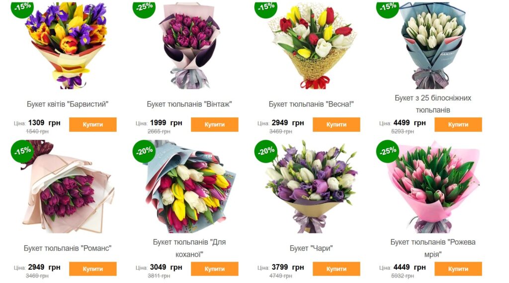 В інтернет-магазинах вартістю букетів ще більша. Найпростіший букет тюльпанів із 15 штук можна замовити за 1100 гривень, але подекуди доставку букету з 11 тюльпанів пропонують від 1600 гривень.