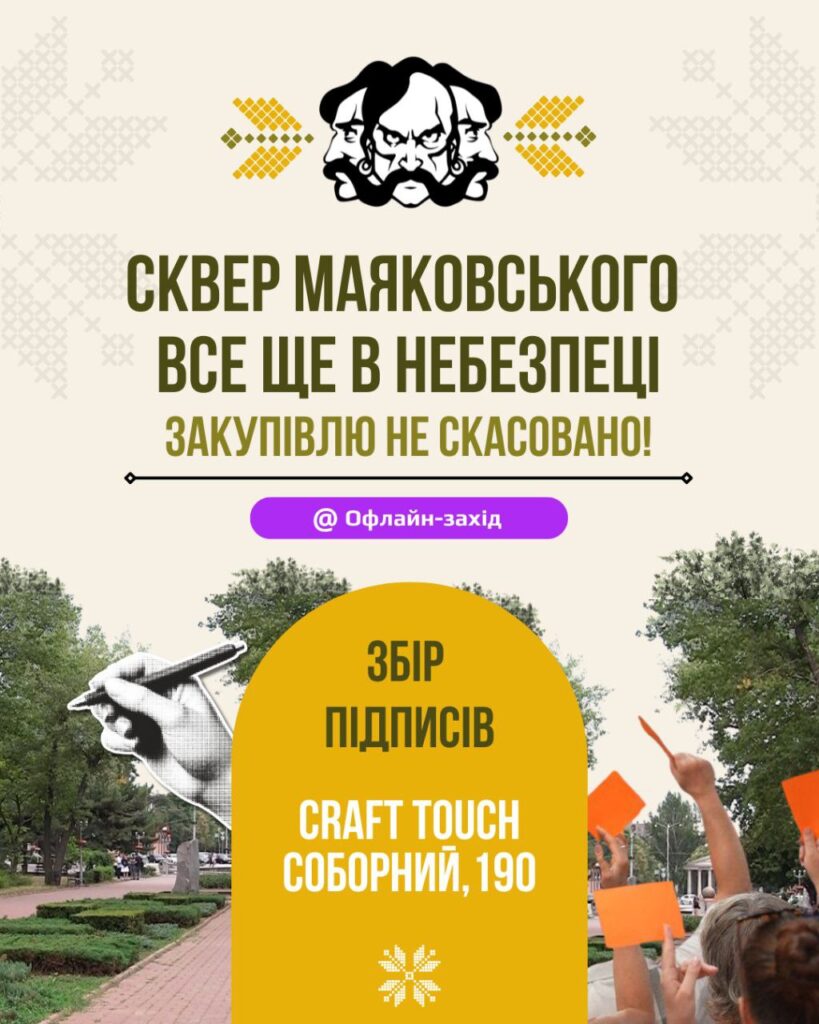 Зараз триває збір підписів за скасування тендеру. Підтримати звернення можна в пабі «Крафтач» (субота–вівторок, 15:00–23:00). Активісти наголошують: чим більше підписів, тим більше шансів зберегти сквер від перебудови.