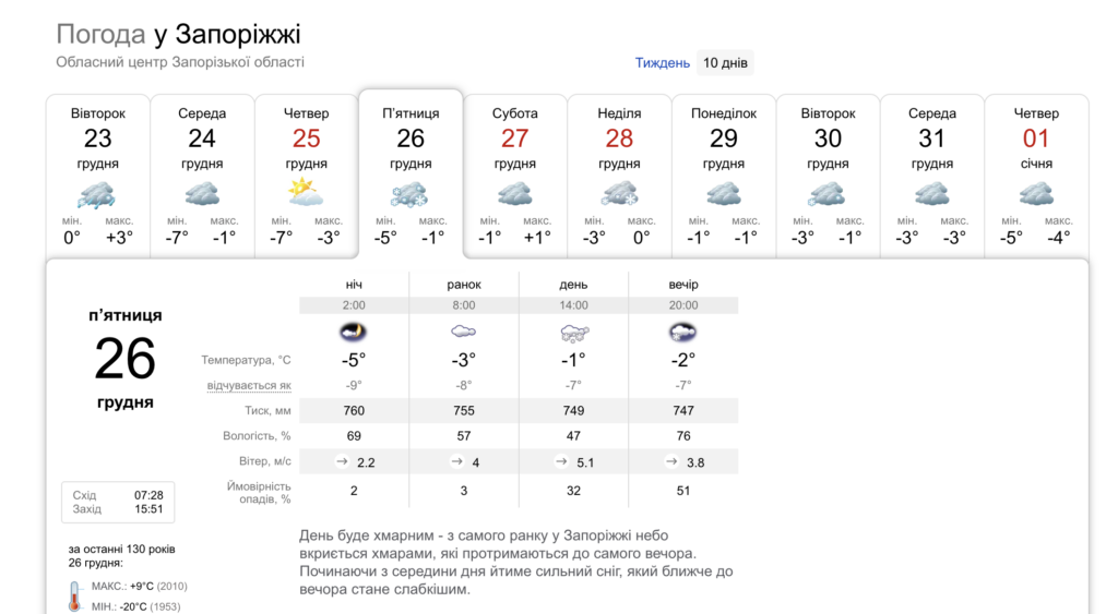 - 26 грудня (п’ятниця) — хмарно протягом усього дня, увечері можливий сніг.