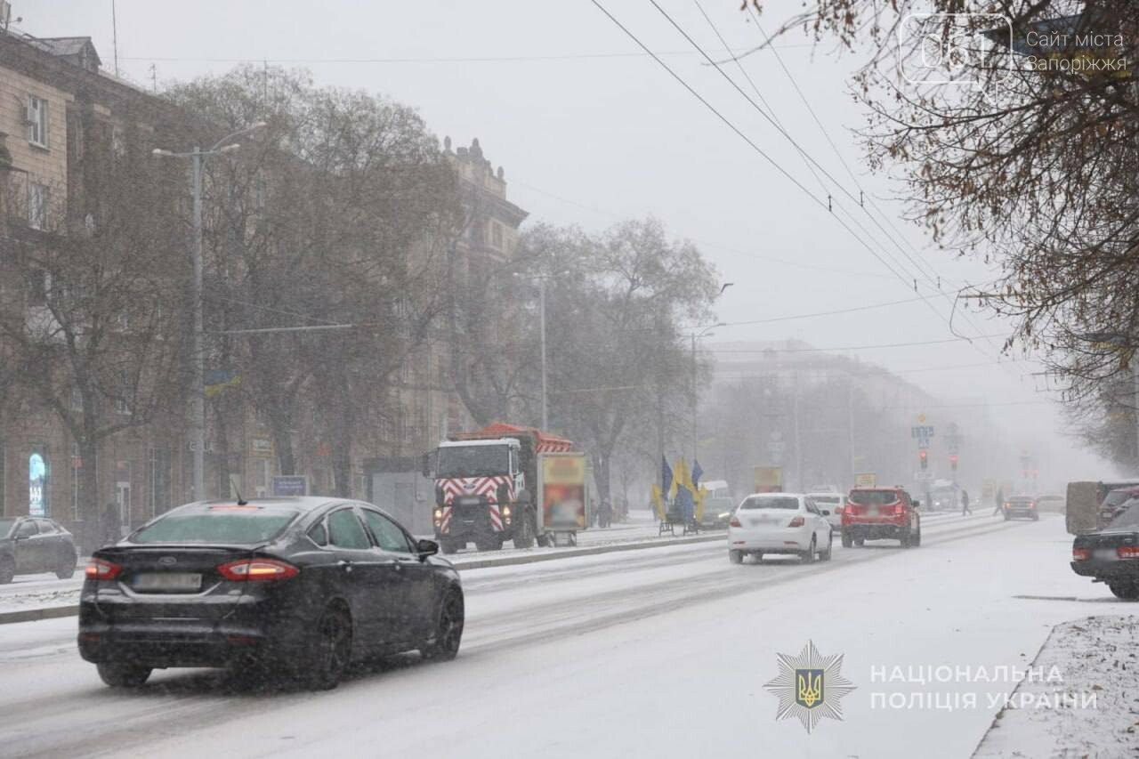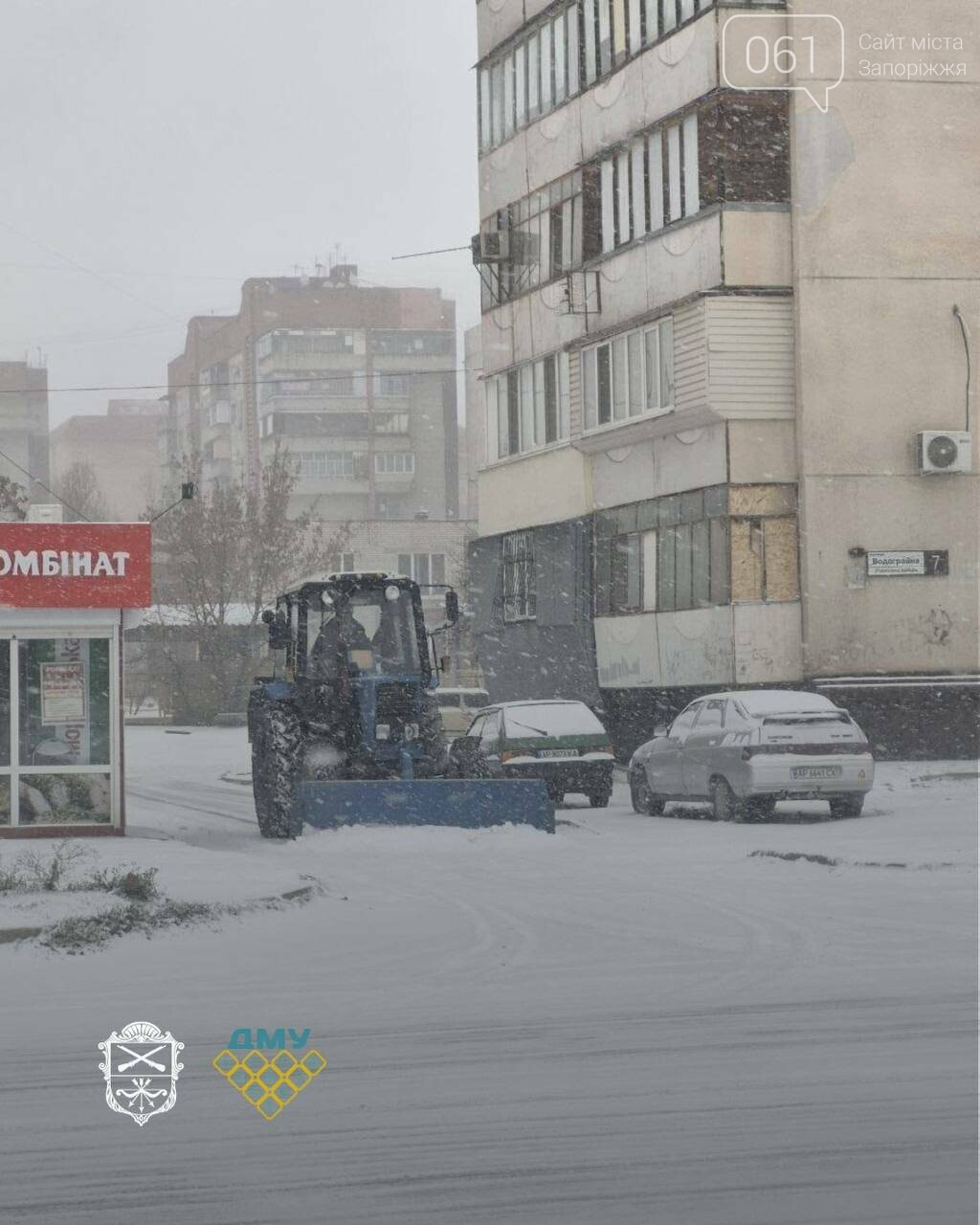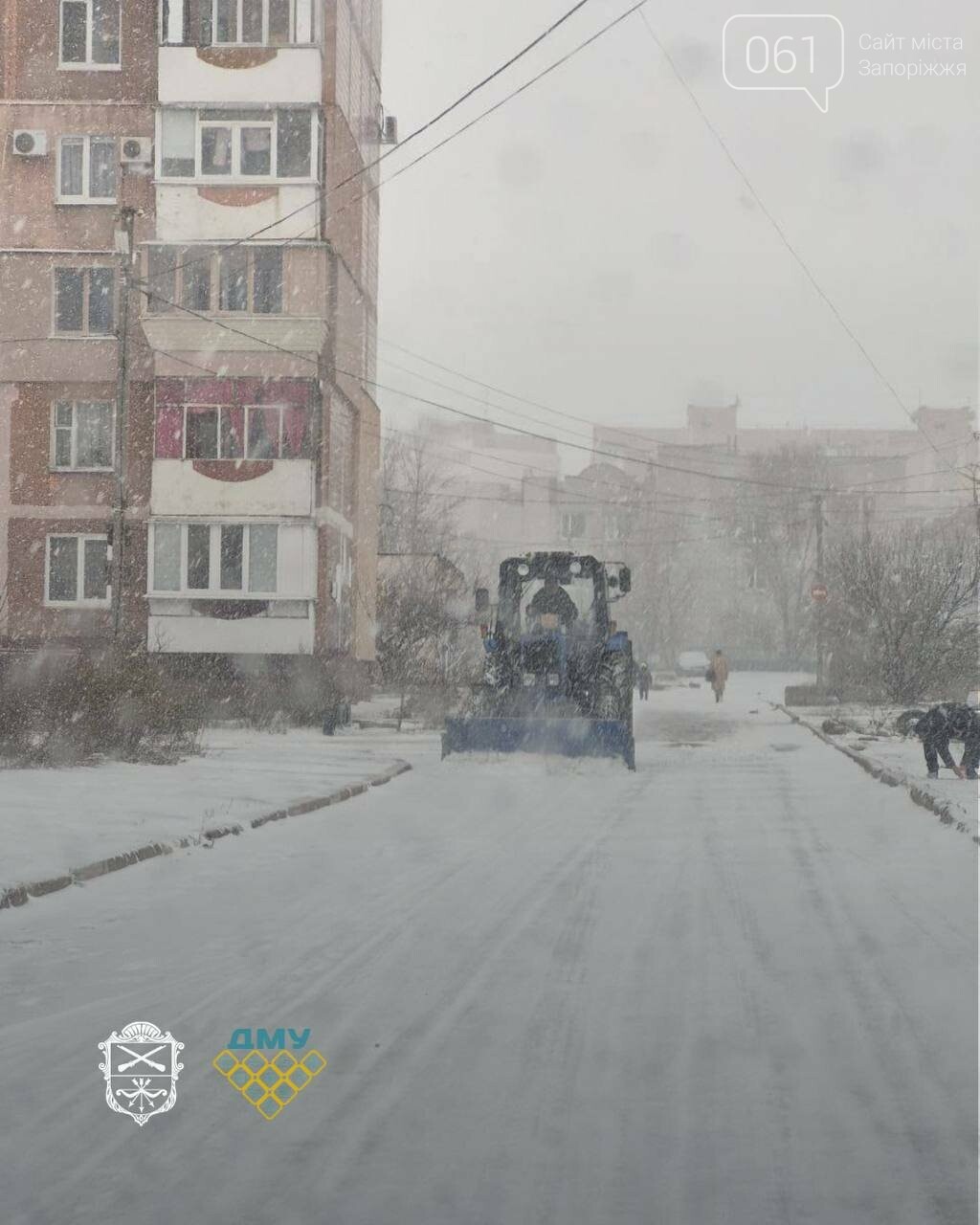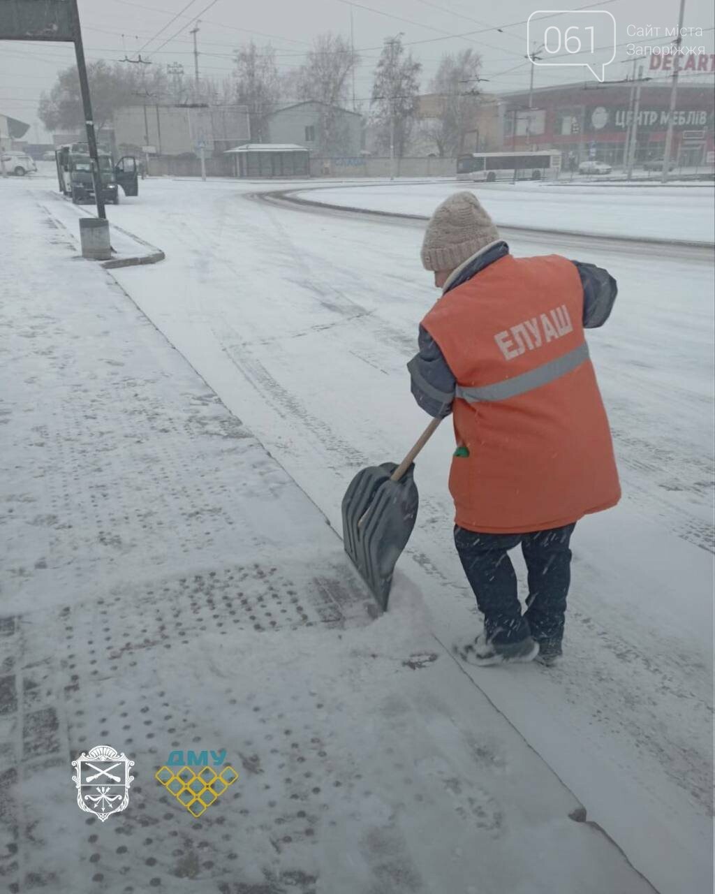 Як повідомили в Запорізькій міській рад, на вулицях працює 44 одиниці техніки. Також залучено 65 працівників підприємства. Проводиться посипка доріг та прибирання снігу з тротуарів і зупинок громадського транспорту.