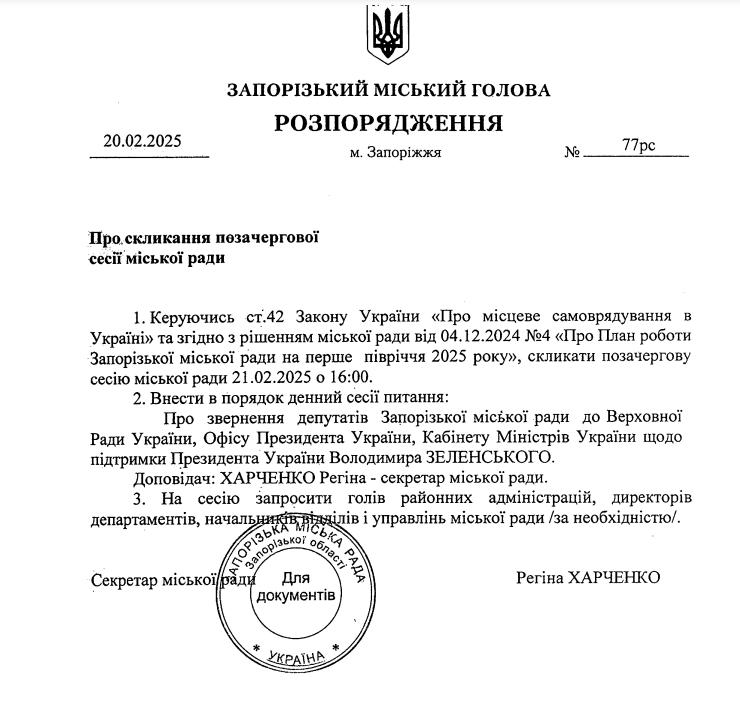 Відповідне розпорядження підписала секретар Запорізької міської ради Регіна Харченко 20 лютого 2025 року.
