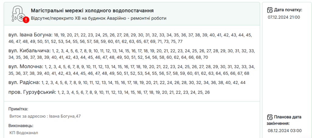 Планова дата закінчення робіт: 08.12.2024 о 03:00.