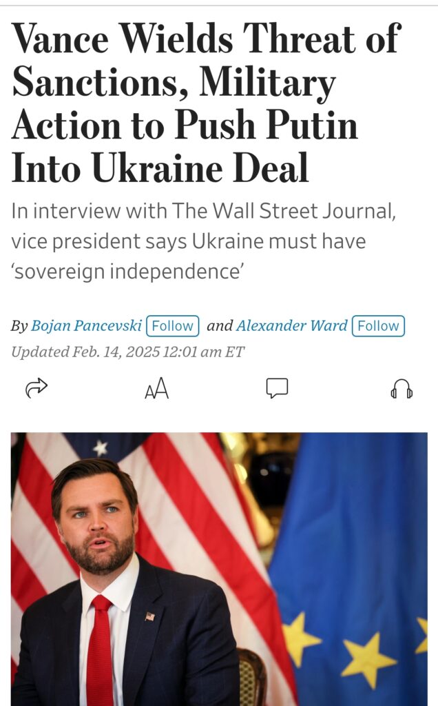 Про це заявив віце-президент США Джей Ді Венс в інтерв’ю WSJ.