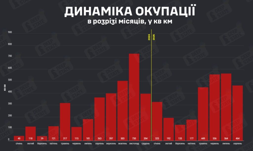 Як інформує Акцент з посиланням. На DeepState, у серпні темпи окупації нарешті впали на 18% — ворогом було окуповано 464 кв км.