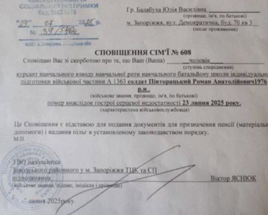 Мешканка Запоріжжя, Вікторія, поділилася шокуючою історією про “мобілізацію” її батька, яка завершилася трагедією. Вона розповіла, як у ніч на 22 липня її батька насильно забрали в мікроавтобус поблизу його будинку. Відразу після цього чоловік зміг здійснити один телефонний дзвінок до дружини, під час якого повідомив, що його везуть до навчальної частини в Новомосковськ (місто Самар).