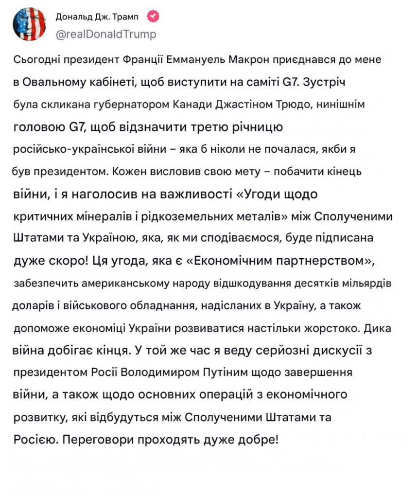 Дональд Трамп у соцмережі сьогодні прокоментував результати саміту G7, на якому зокрема обговорювалися і питання війни Росії проти Україну.