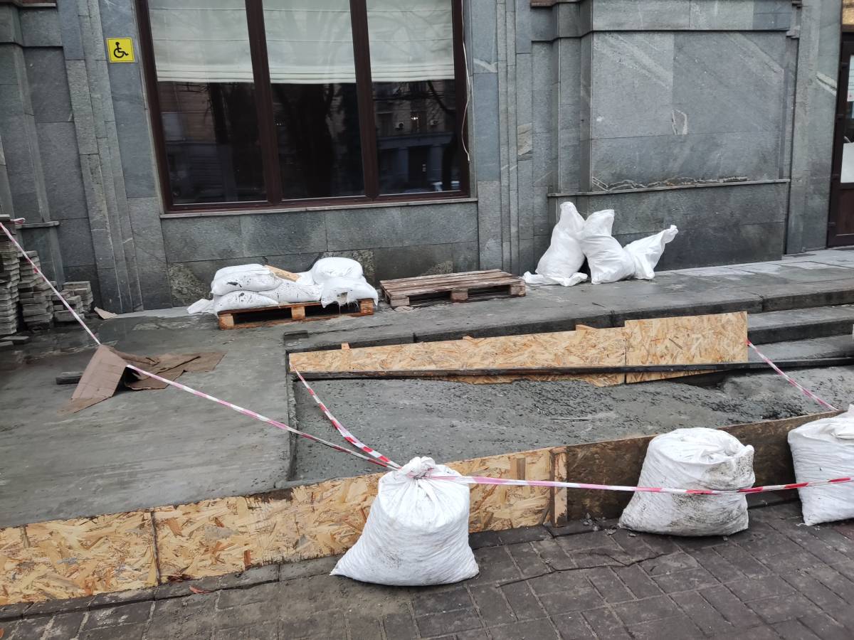 Вже зняли центральну вивіску, на ганку будують, найімовірніше, пандус та встановили нову конструкцію для реклами кіносеансів.