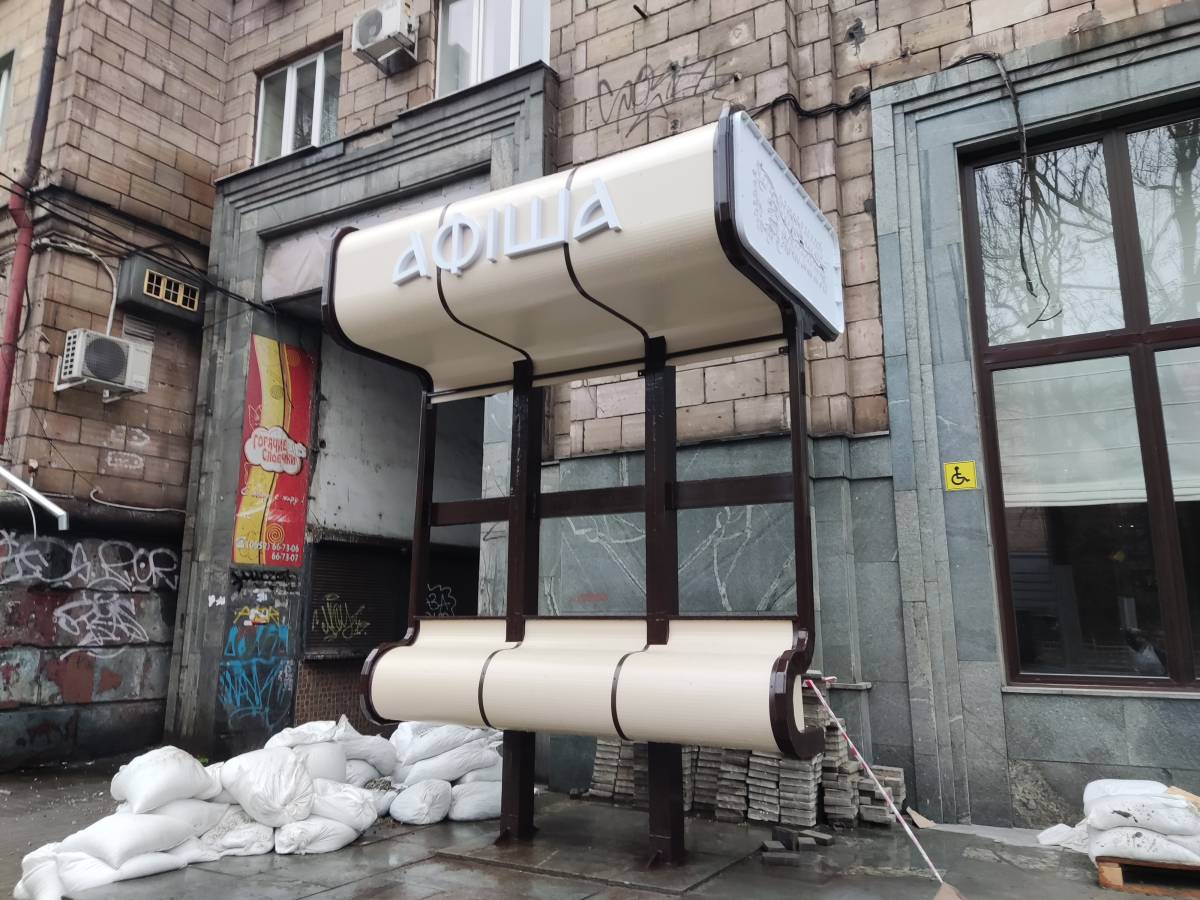 Із фасаду кінотеатру ім. Довженка вже зняли вивіску та розпочали ремонт ганку