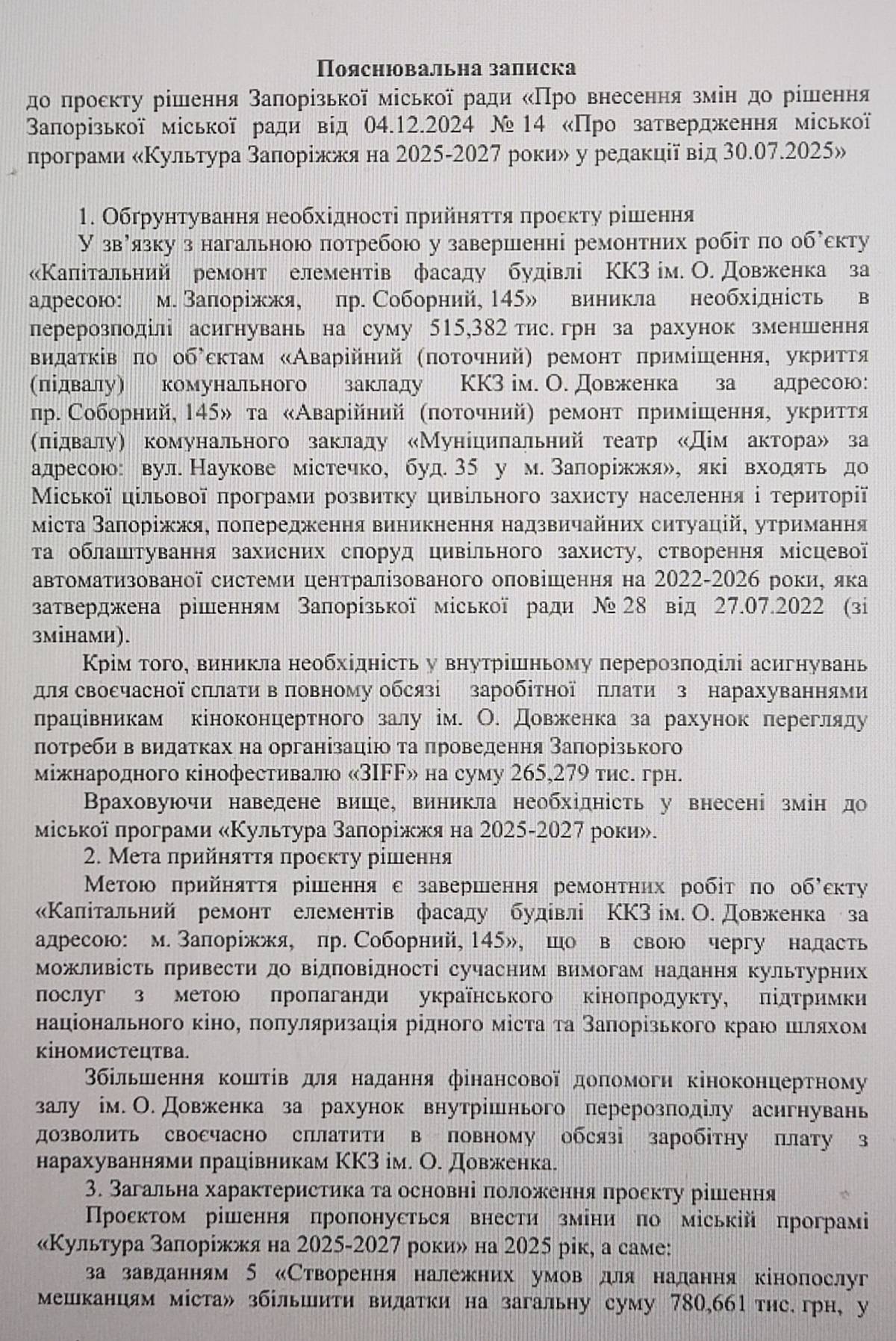 Запорізька міська рада ще у кінці жовтня планувала внести зміни до програми «Культура Запоріжжя», щоб завершити ремонт фасаду кіноконцертного залу імені Олександра Довженка та виплатити зарплату його працівникам.