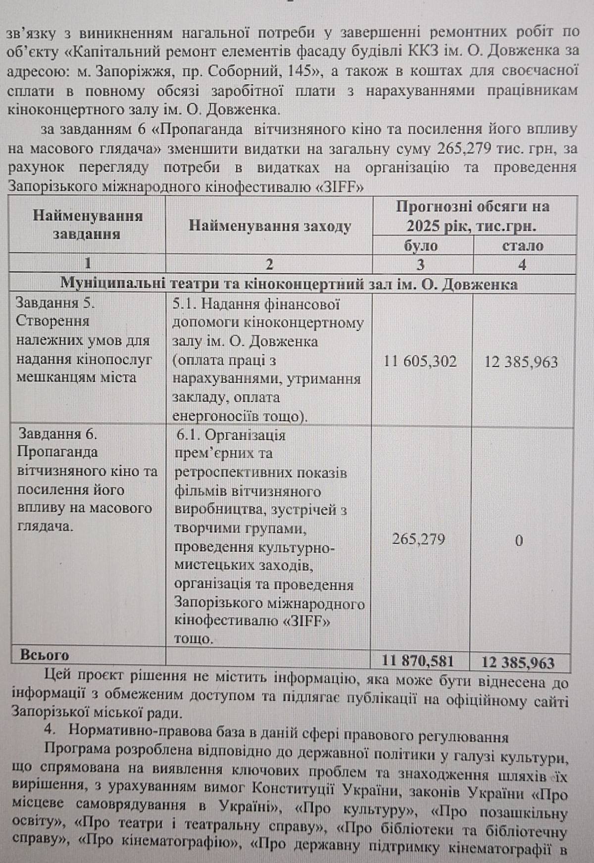 Для цього перерозподілять кошти між міськими програмами: скоротять фінансування Запорізького міжнародного кінофестивалю ZIFF, муніципального театру “Дім актора” та залишать без ремонту укриття у підвальних приміщеннях кінотеатру.