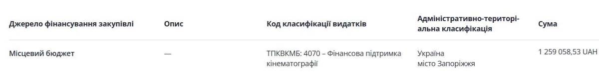 Закупівля відбулася без використання електронної системи; код класифікації видатків – “фінансова підтримка кінематографії”.