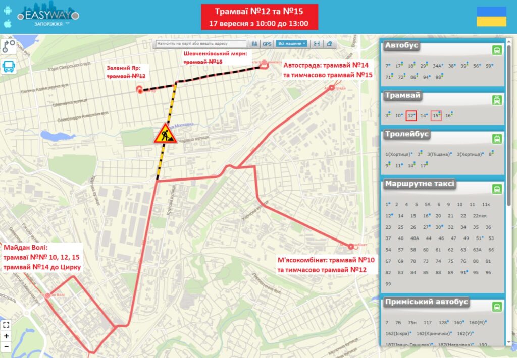 Як повідомляє управління з питань транспортного забезпечення та зв’язку Запорізької міської ради, 17 вересня з 10.00 до 13.00 будуть проводитися ремонтні роботи на контактній мережі (заміна тросової системи) від вул. Іванова до вул. Шевченка. У зв’язку з цим на зазначеній ділянці буде тимчасово призупинено рух трамвайних маршрутів № 12 та 15.