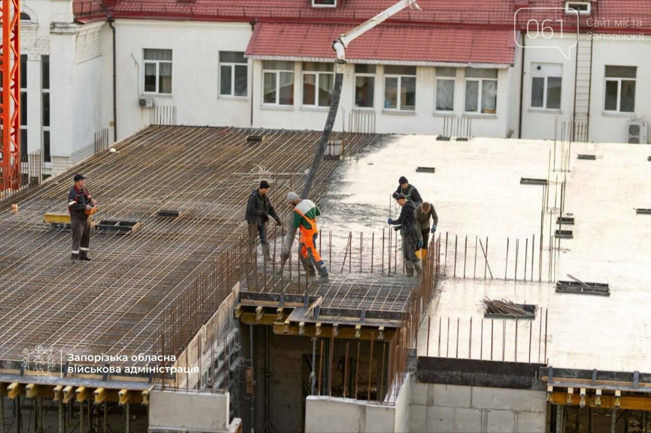У Запоріжжі триває зведення нового хірургічного корпусу обласної дитячої лікарні. Нині будівельники виконують ключовий етап – заливку монолітної плити між третім і четвертим поверхами.