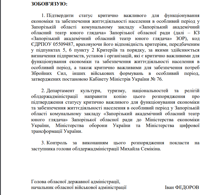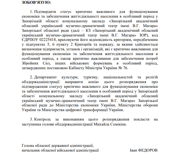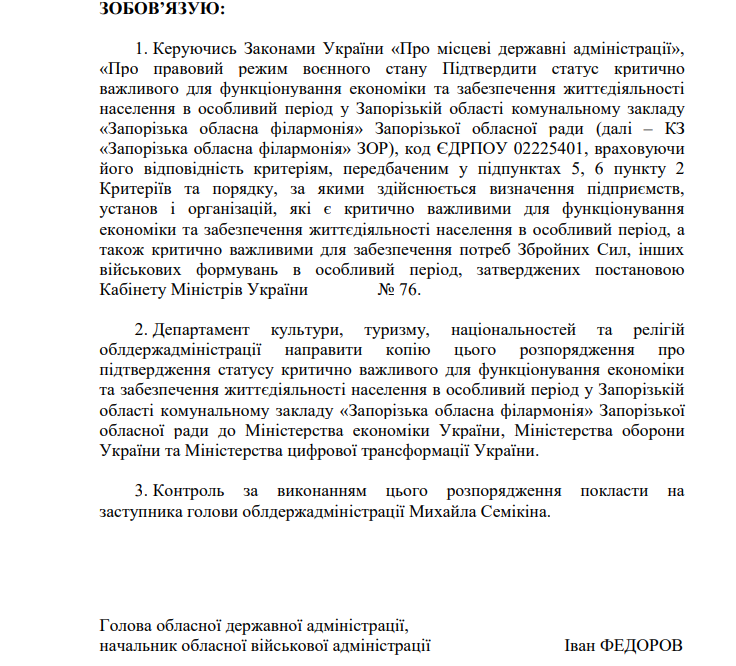 В.Г. Магара» та «Запорізька обласна філармонія підтверджено статус критично важливих для функціонування економіки та забезпечення життєдіяльності населення Запорізької області в особливий період.