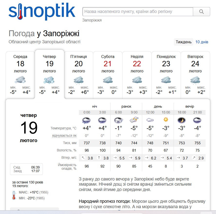 У четвер, 19 лютого, погода буде похмурою протягом усього дня. У нічні години температура повітря становитиме близько +4°, однак уже зранку різко похолодає до -5°. Вранці нічний дощ зі снігом зміниться інтенсивним снігопадом, який триватиме до середини дня. Вдень температура коливатиметься в межах -5…-3°, а ввечері знизиться до -4°. Ймовірність опадів у першій половині дня сягатиме 90%, тиск поступово зростатиме, а вітер посилюватиметься до 6 м/с.