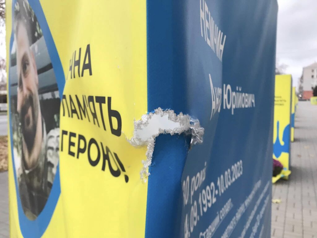 У Запоріжжі на проспекті Соборному на декілька кварталів тягнеться Алея Героїв, на якій встановлені призми, присвячені полеглим захисникам. Однак одну із них, ймовірно, пошкодили невідомі особи.