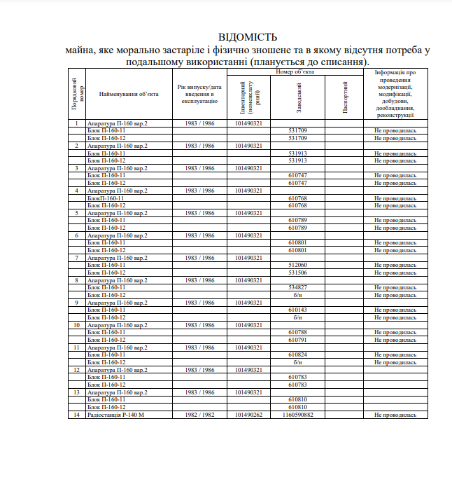 - Апаратура П-160 вар.2 (рік випуску/дата введення в експлуатацію 1983/1986), а також блоки П-160-11 та П-160-12 (кілька одиниць)