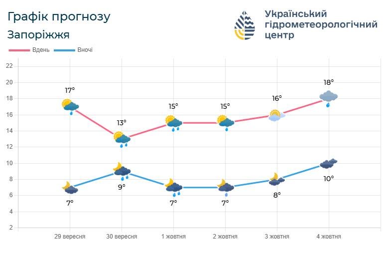 З 30 вересня по 3 жовтня у Запоріжжі на погодні умови впливатиме активний циклон. Впродовж будніх днів очікуються дощі, за винятком 3 жовтня. Завтра очікується зниження температури повітря до +13°С вдень. Про це повідомили у Запорізькому обласному центрі з гідрометеорології.