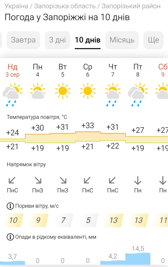 - 4-6 серпня: без опадів, вночі +19..+21, вдень +30..+33 градуси