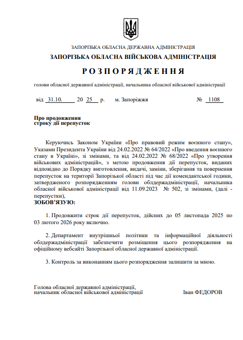 Голова Запорізької обласної державної адміністрації, начальник обласної військової адміністрації Іван Федоров підписав розпорядження № 1108 від 31 жовтня 2025 року, яким продовжено строк дії всіх перепусток на пересування під час комендантської години.
