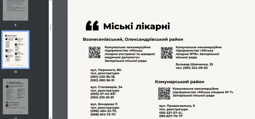 Департамент з питань охорони здоров’я та медичного забезпечення Запорізької міської ради розробив «Путівник медичних послуг комунальних закладів охорони здоров’я міста Запоріжжя». Відбулась його презентація для керівників медзакладів міста, представників ветеранської спільноти та військовослужбовців. Про довідник розповіли на сайті міськради.