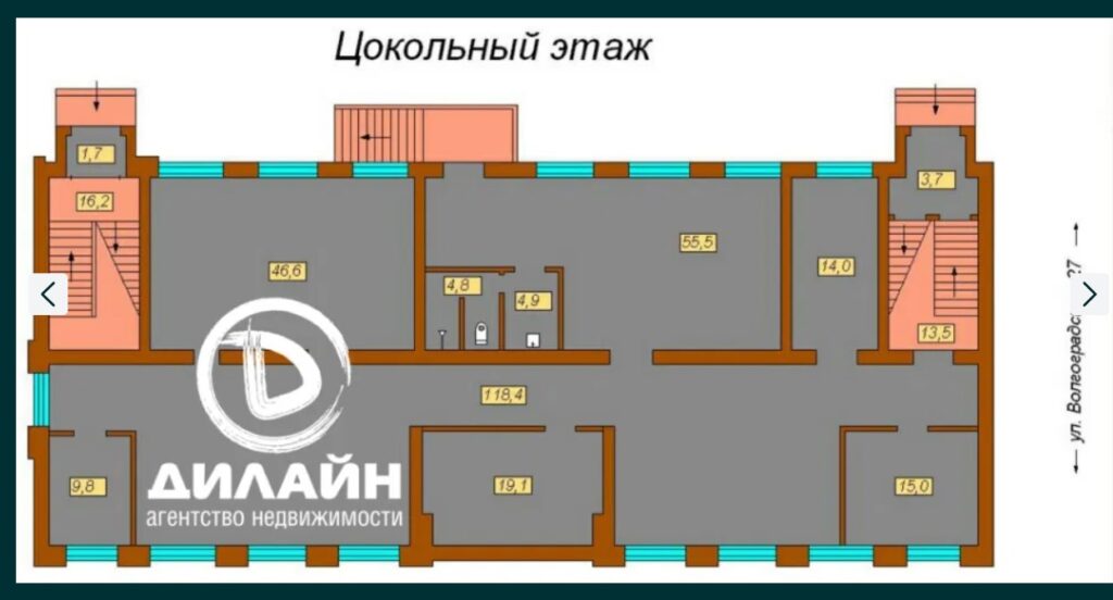 Конфігурація першого поверху та цоколя мають «вільне» планування і підходить до розташування магазинів, складів і сучасних офісів. Три верхні поверхи «скроєні» під кабінети. У всіх приміщеннях зроблено ремонт. На кожному поверсі обладнані туалетні кімнати.