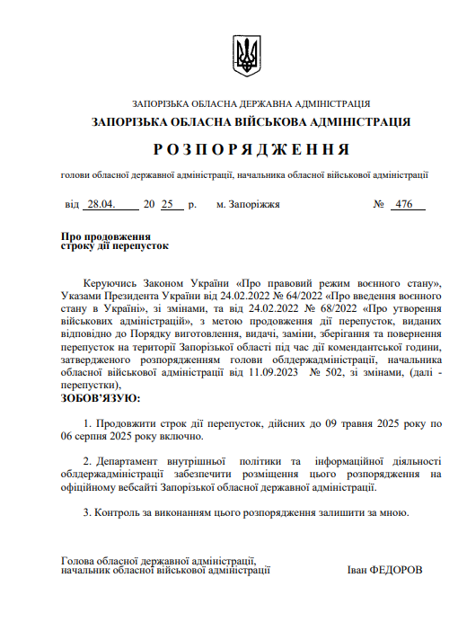 Відповідно до розпорядження голови Запорізької обласної державної адміністрації, начальника обласної військової адміністрації Івана Федорова №476 від 28 квітня 2025 року строк дії перепусток на період комендантської години продовжено до 6 серпня 2025 року включно.