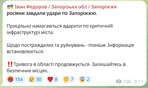 За інформацією керівника обласної військової адміністрації Івана Федорова, російські війська завдали ударів по Запоріжжю, намагаючись прицільно вразити об’єкти критичної інфраструктури міста.