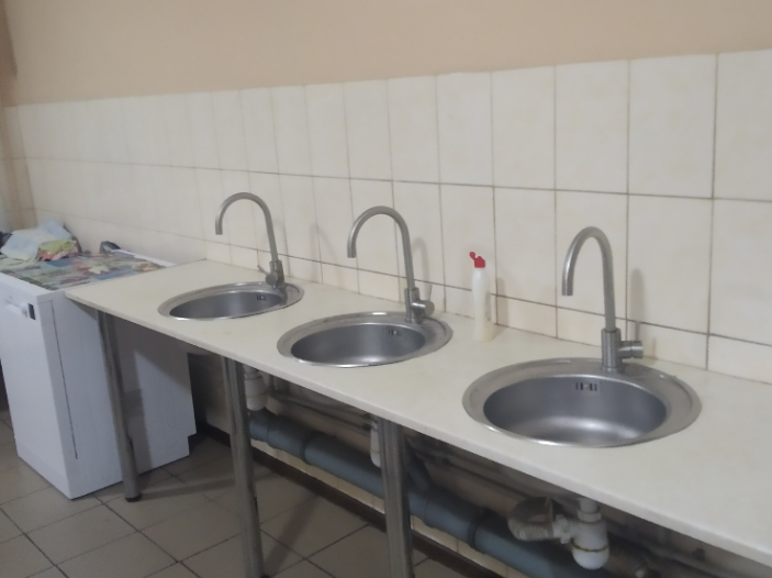Санітарні приміщення із душовими та туалетами функціонують у належному стані, а на першому поверсі встановлено пральні машини та сушарки. Також є кімнати для спільного відпочинку та загальних зборів.